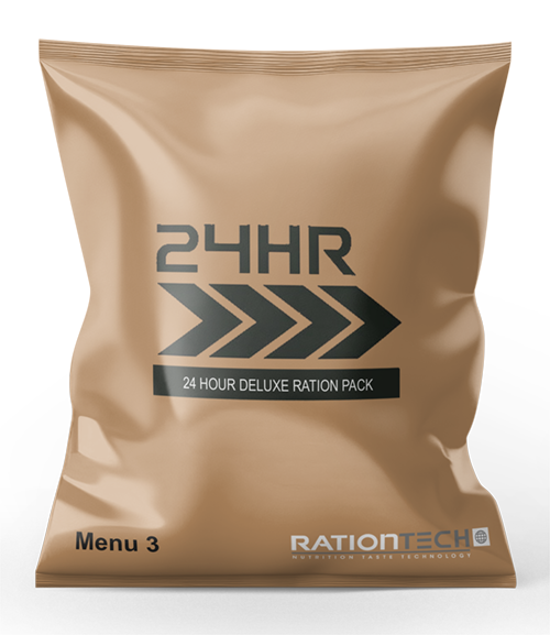 This DELUXE 24-hour MRE RATION PACK contains the following long-shelf life items: 1 Breakfast (Maize Porridge), 2 Main Meals (Mild and spicy chicken pasta, Beef and vegetable casserole), 1 dessert (Caramel cake), 4 hot beverages (2 tea and 2 coffee) with 4 creamers and 4 sugar sachets, 3 cold beverages (3 Isotonic drinks – various flavours), 5 snacks (Fruit cubes, Peanuts raisins and choc chips, Chocolate Energy Bar, Nut Butter, Fruit Oat Biscuits), Chewing Gum (10 pieces), 2 Salt sachets, 2 Pepper sachets, 3 Heating Kits (flameless – for 3 meals), 4 Water Purification tablets (to sterilise water for consumption), a Spork, Tissues and Wet Wipes.